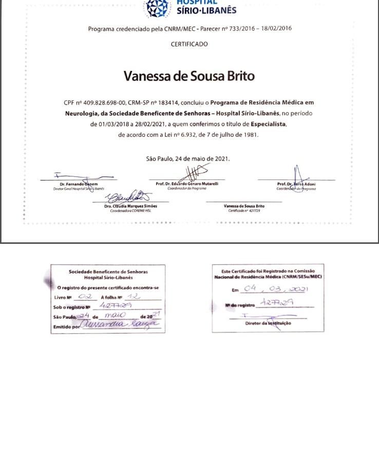 Sou a Dra. Vanessa Brito Nakamura, neurologista CRM-SP 183424, com fellowship em neurogenética pela USP e experiência no HSL. Especializo-me em telemedicina neurológica, focando em neurogenética, cognição, longevidade e condições como cefaleia, vertigem e demências.