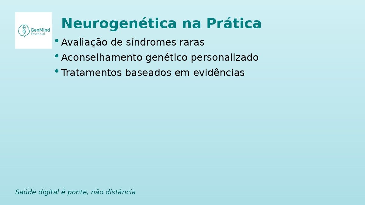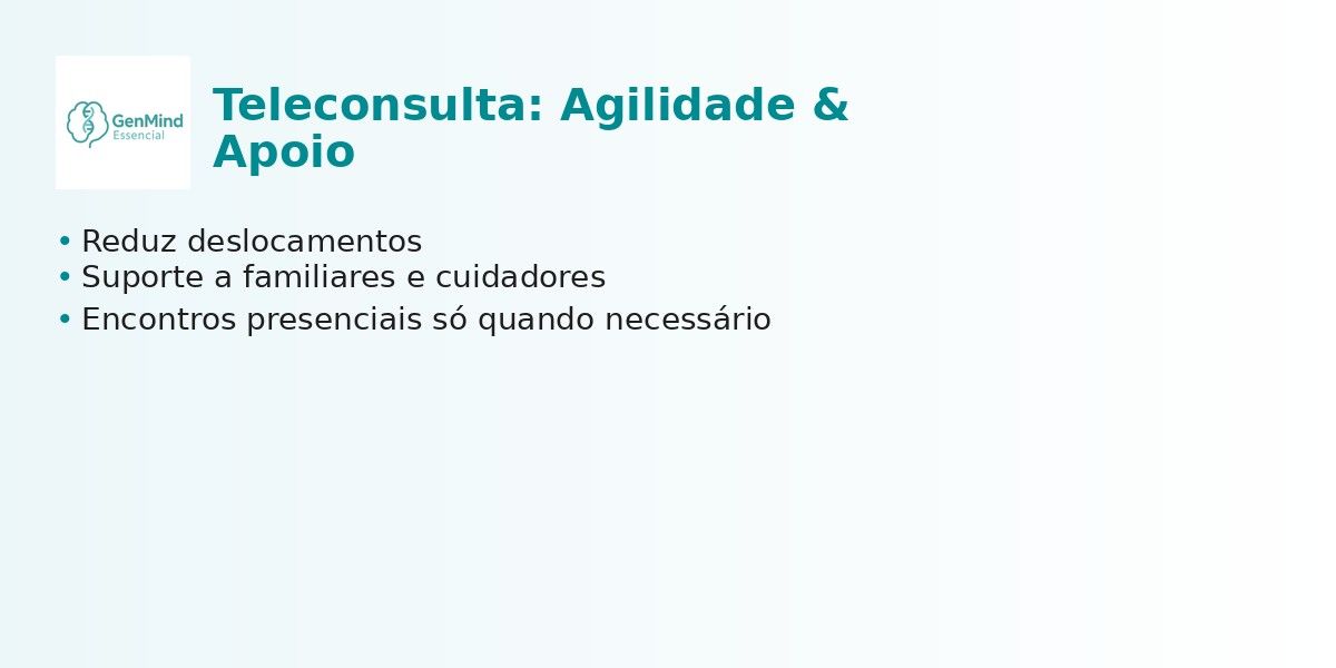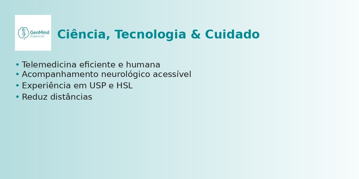 Benefícios: Atendimento seguro à distância, triagem eficiente e suporte a cuidadores, priorizando visitas presenciais apenas quando necessário. Meu objetivo é promover saúde cerebral duradoura com empatia e clareza.